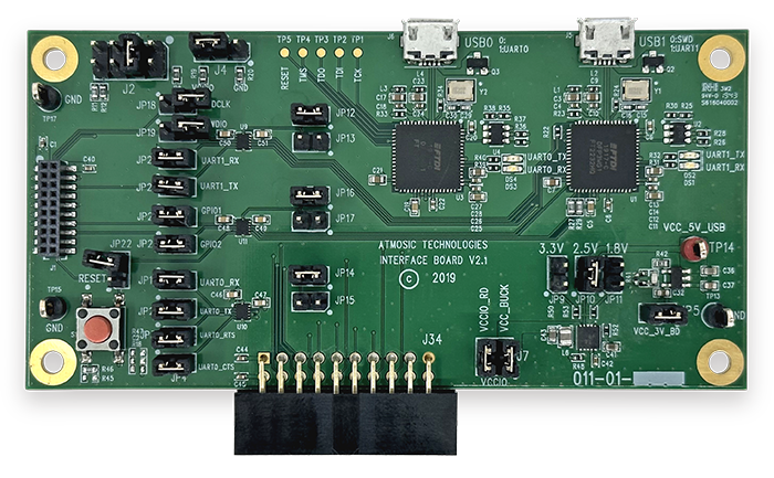 The Atmosic Interface Board provides a host computer access to some commonly needed interfaces on an Atmosic chip-based DUT. This board is for use with ATM2 and ATM3 designs.